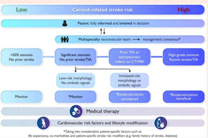 图表从左到右展示了脑卒中风险的梯度。“显著” 狭窄通常被定义为颈动脉腔直径减少≥50%。脑卒中风险增加的患者应在心血管风险因素、生活方式改变和优化药物治疗的基础上评估血运重建。理想情况下,进行还是推迟血运重建的决定应基于多学科 (神经血管团队) 的共识声明。为了帮助患者做出决定,神经血管团队还可能建议首选的血运重建模式 (根据患者特定因素和当地专业知识)。患者在护理决策过程中占据中心地位,需要关于疾病相关脑卒中风险和治疗选择的完整信息,包括与不同治疗方案相关的风险及其优势。